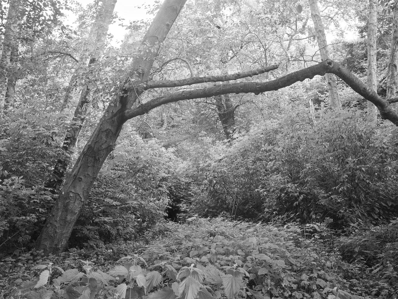 Large trees and dense foliage surrounding a small creek in a canyon. Photographed on a 4x5 large format camera with black and white HP5 film. Framed Paper: Luster, Fine Art Paper: Matte, Professional Paper: Luster