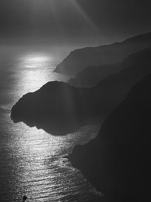 The harsh sun shines down on the ocean along the channel island coastline. Photographed on a medium format film camera with black and white Delta film. Framed Paper: Luster, Fine Art Paper: Matte, Professional Paper: Luster
